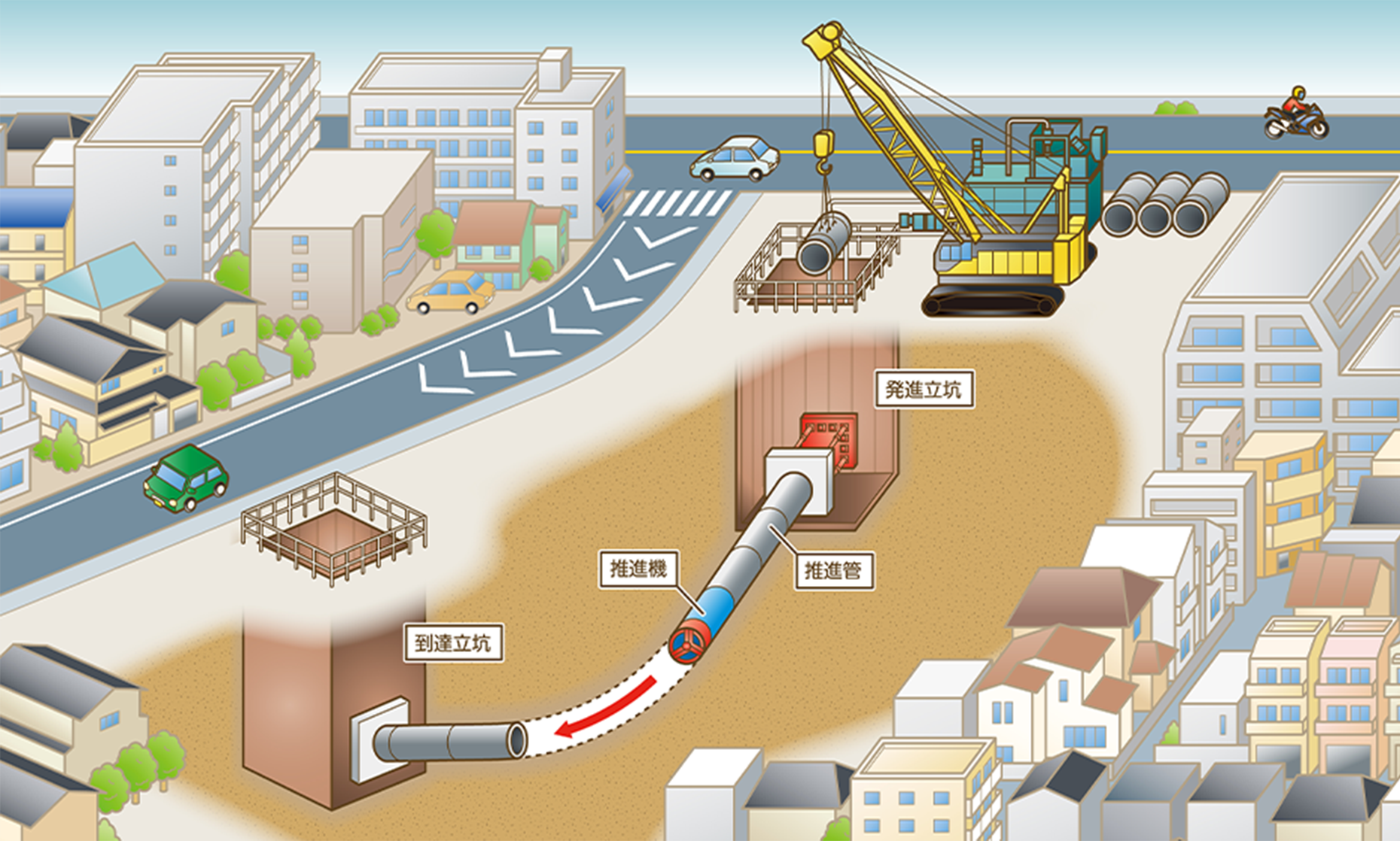 推進工事とは、道路を掘り返さずに地中に管(下水道や電線、通信ケーブルなど)を通す工事です。